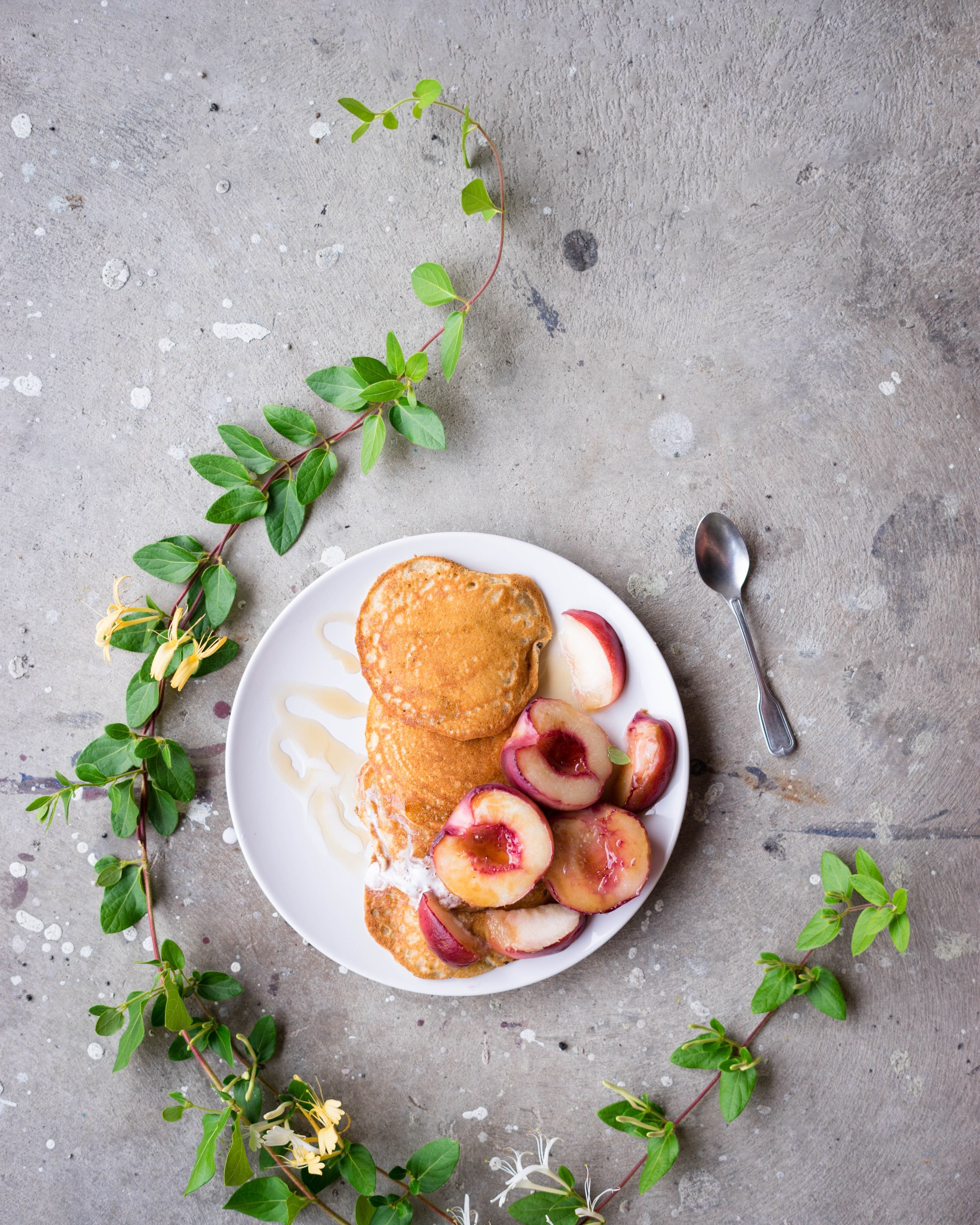 I love nearly every stone fruit, but me and peaches… that´s a very intense love haha. The consistency, the mixture of sweet and sour… it´s just everything that makes peaches so irresistible! And well, I guess I don´t have to mention that pancakes are one of the best things on earth…